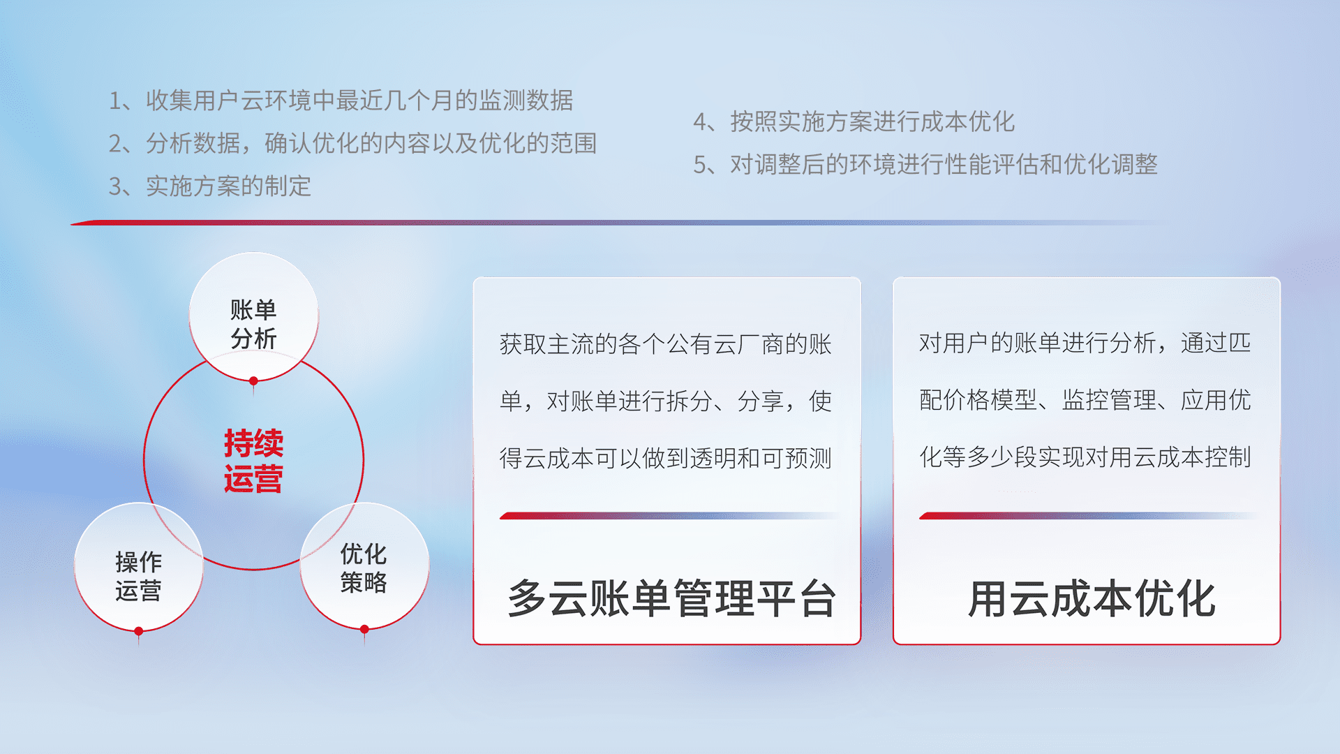 通过多云纳管,,,以统一的资源数据模型把客户的云资源进行抽象和封装,,,进而实现对多云资源的统一操作,,,,保障云资源管理的可靠性、、稳定性与可用性。。。量身定制化运维内容,,,配置、、、开发运维、、补丁管理、、、备份、、、监控、、、、认证和访问管理、、、审计和日常巡检等,,保障在用云过程中的可靠度,,,,稳定度以及高可用率。。。。