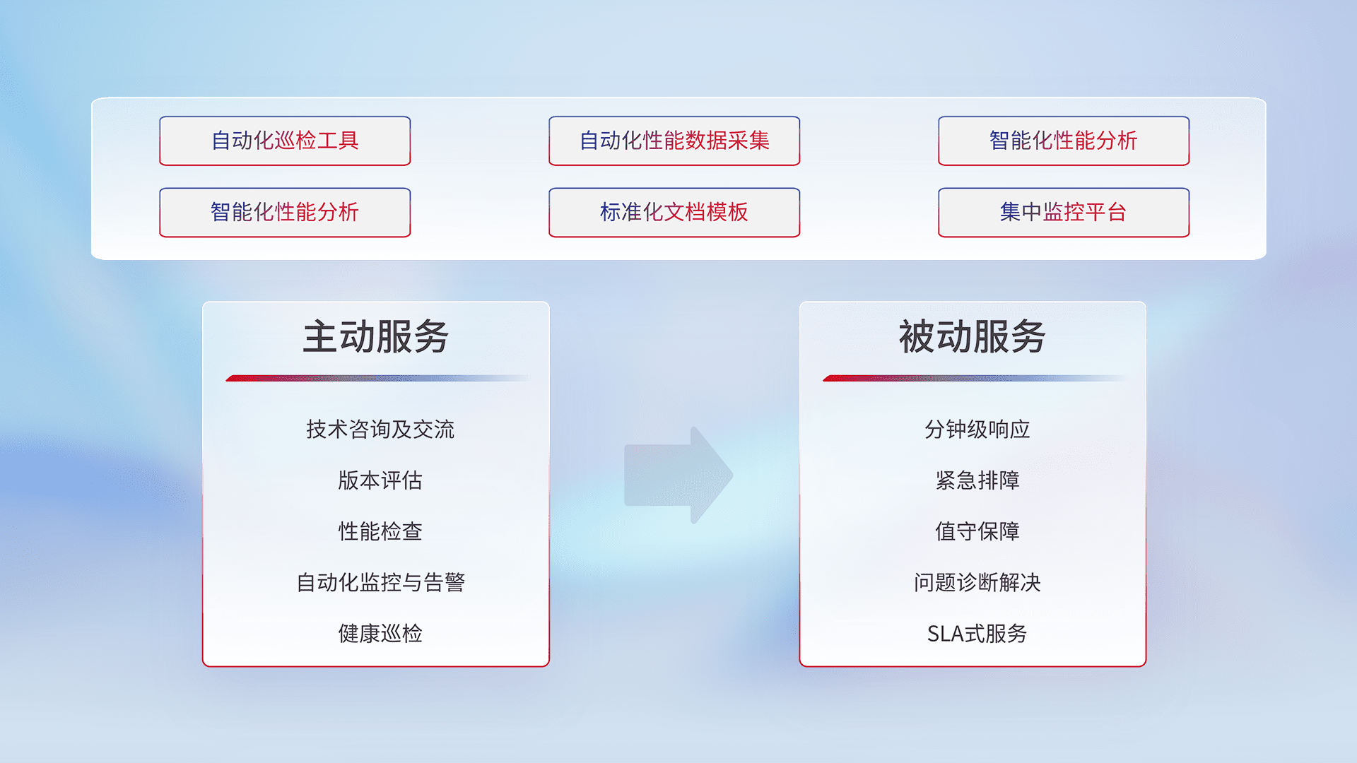 智能化工具和标准化文档,,,保障服务质量,,,提供主动服务(包含技术咨询、、、版本评估、、、性能检查、、、、自动化监控与告警、、、健康巡检)和被动服务包含(分钟级响应、、紧急排障、、、值守保障、、问题诊断解决、、、SLA服务)。。